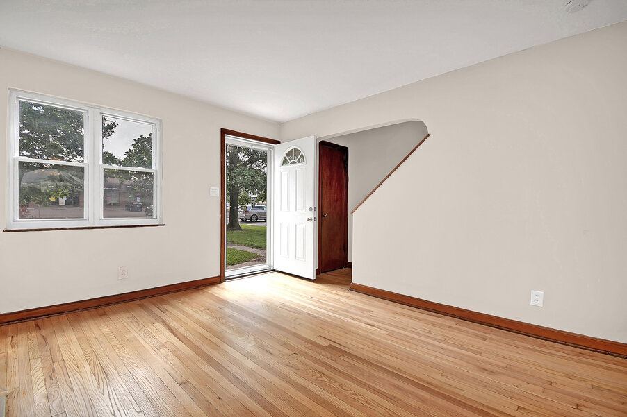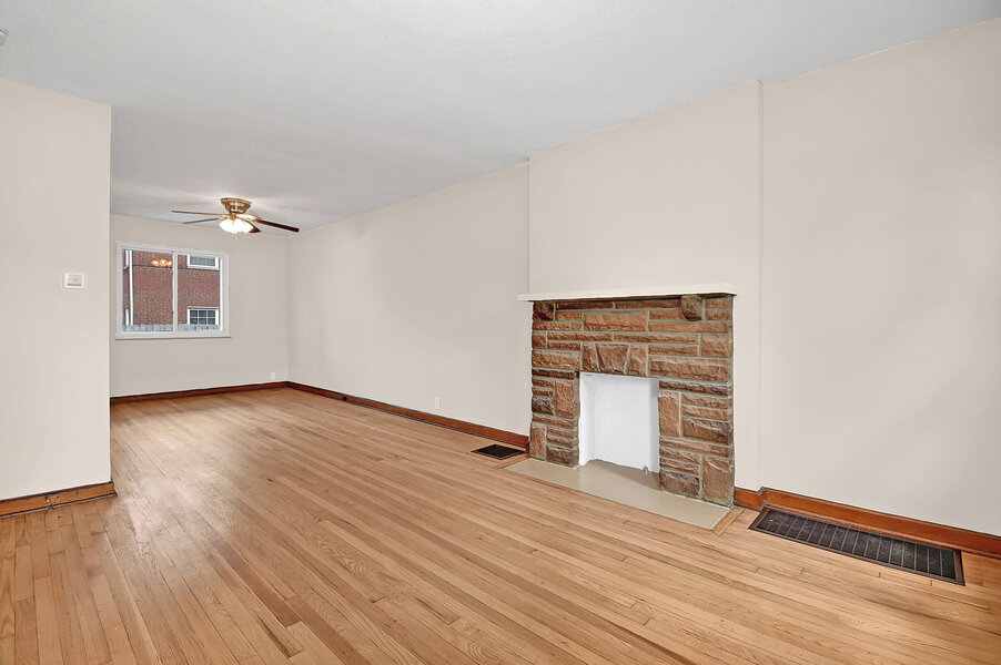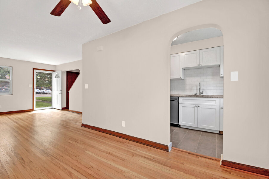 Living room | Large living room with refinished hardwood floors, dining nook, ceiling fan, and lots of natural light |