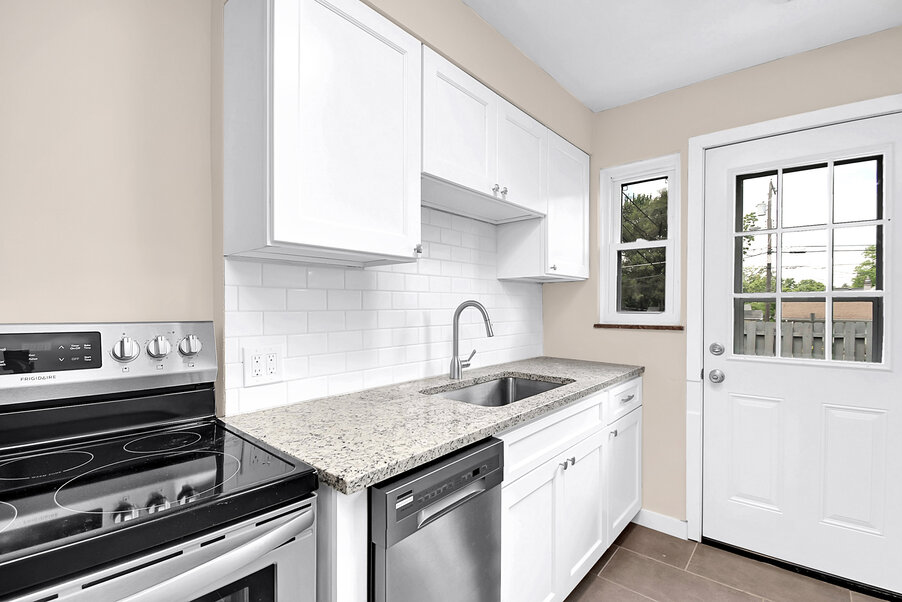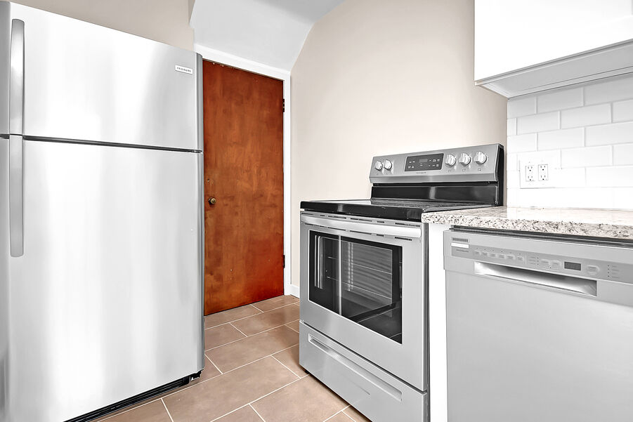 Kitchen | Premium cabinets, granite countertop, tile backsplash, undermount sink, and stainless-steel appliances including flat-top range, dishwasher, and refrigerator |
