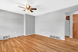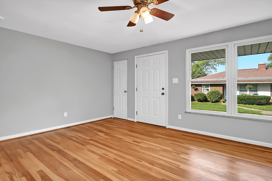 Living room | Large first floor living room with refinished hardwood floor, ceiling fan, and lots of natural light |