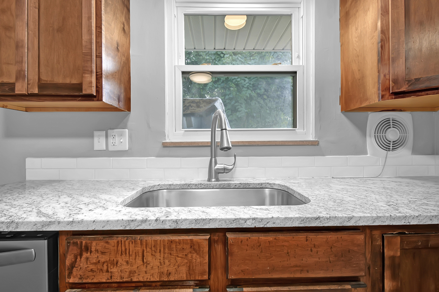 Kitchen | Large kitchen with oak cabinetry, granite countertops, tile backsplash, undermount sink, LVP flooring, and appliances including dishwasher and garbage disposal |